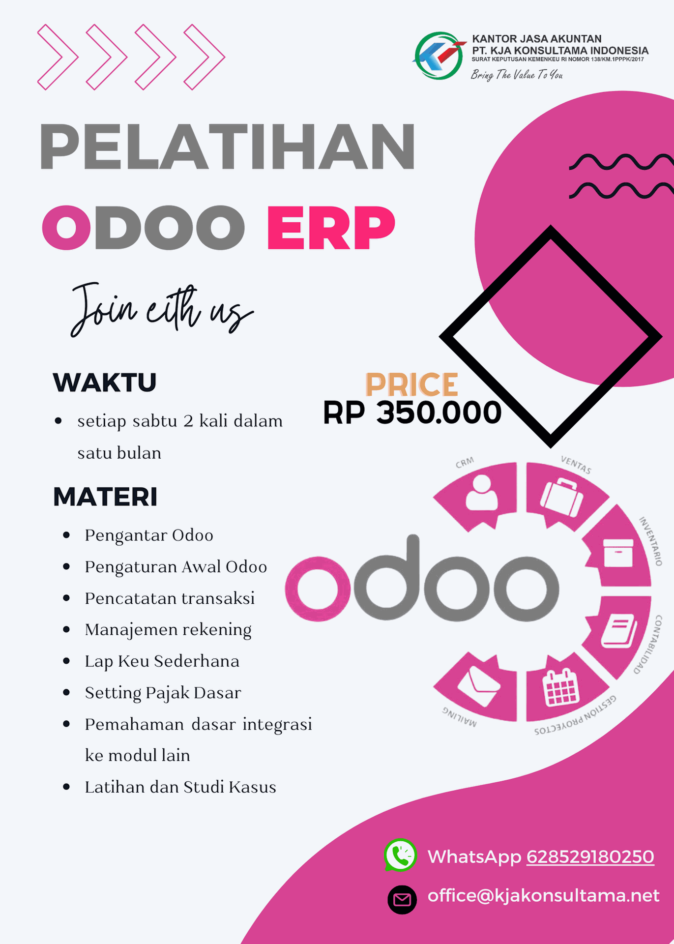 PT KJA Konsultama Indonesia didirikan untuk menjadi solusi atas permasalahan berbagai permasalahan pribadi maupun perusahaan. kami menyediakan berbgai jasa Akuntansi, Jasa Manajemen, dan Jasa Study Kelayakan Bisnis